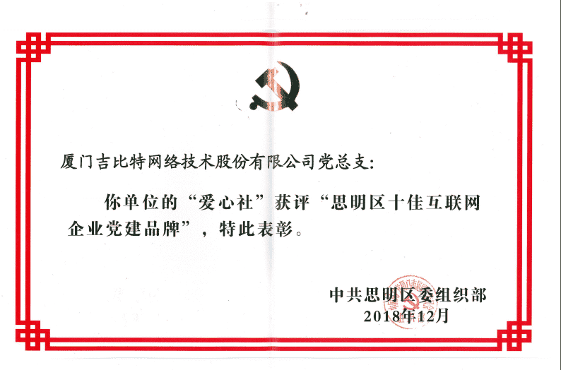 经初审评选、、、、网络评选和专家评审等环节,,,"厦门J9.COM网络技术股份有限公司党总支-爱心社" 从全区28个参评党建品牌中脱颖而出,,,,获评"思明区十佳互联网企业党建品牌"。。。。