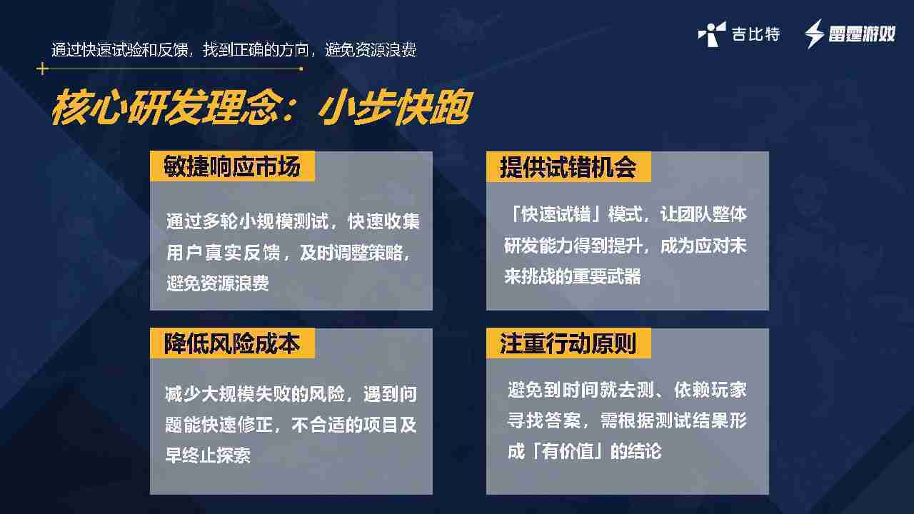 从目前的实践来看,,内容向确实不合适,,因为小步快跑更适合做玩法的尝试,,,,但是如果是内容项,,,,玩法已经确定的,,这时候应该做切片,,而不是做小步快跑的方式,,,,因为做切片的成本是很高的。。。。我们有过两个项目,,,要花很长时间做切片的内容,,,而切片内容只占整个项目的1/10,,但要花的时间成本、、、人力成本、、经济成本可能会到1/3,,,所以用很短的时间做游戏的原型,,,验证其好不好玩,,是想尝试在粗糙表达的情况下,,看看能否获得非常好的留存表现。。。。如果留存表现非常好,,证明游戏内容体验是比较准确和非常好的内核,,,我们会尝试加外围内容的拓展。。。。