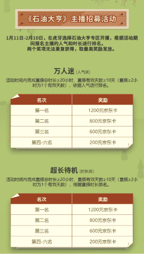 除了“油王”争霸赛,,,精英主播招募活动亦同步开启!!赛事分时长奖和人气奖,,奖励同样丰厚!!!